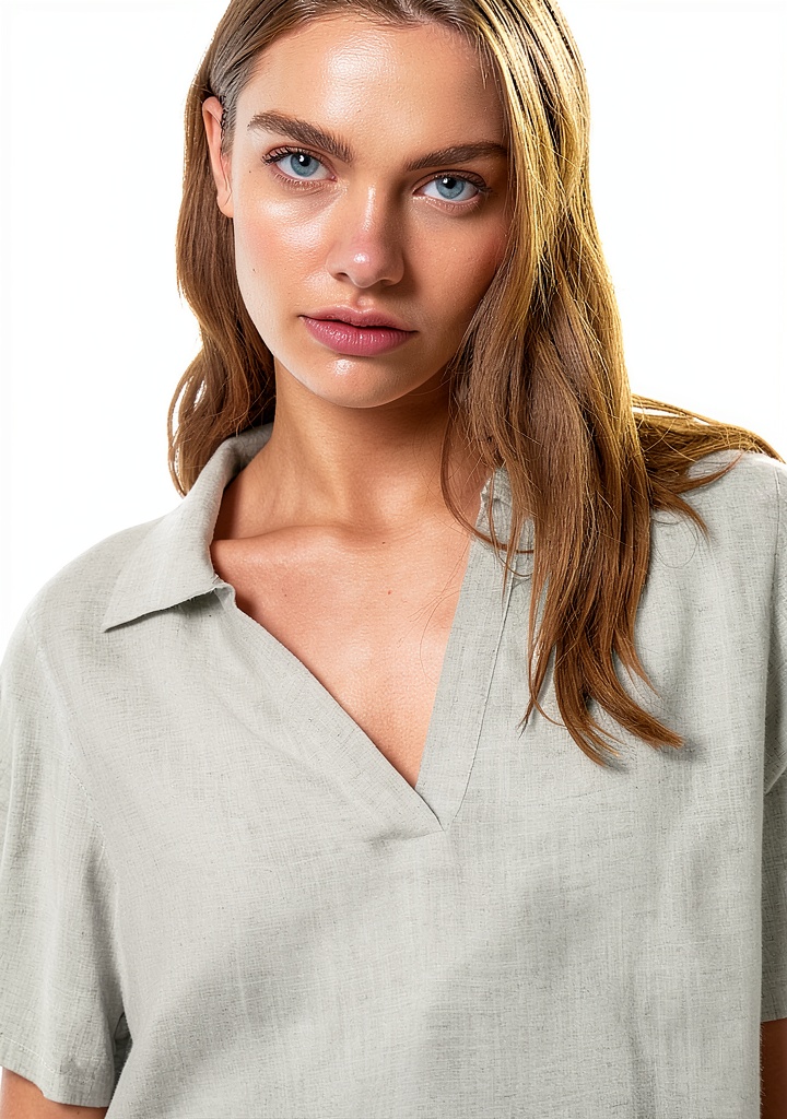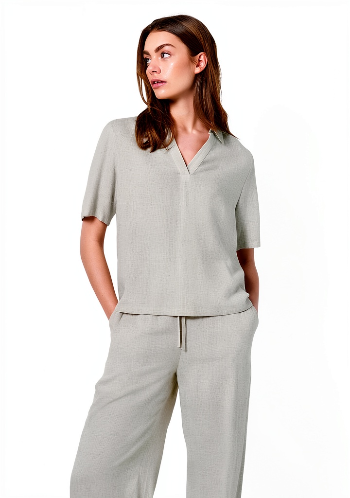 Le top polo est fabriqué en mélange de viscose et de lin, offrant une respirabilité et un confort supérieurs pour un port quotidien.