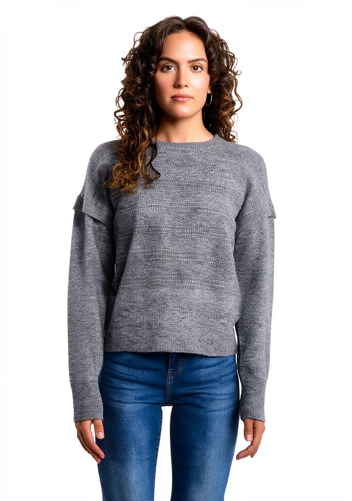 Le pull est fabriqué en laine douce mélangée, conçue pour offrir chaleur et respirabilité, avec un entretien facile en machine à basse température.